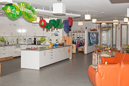 Die Räume des Hauses für Kinder sind Orte der Erfahrung und freien Entfaltung. Zur Krippe gehören ein Spiel-/Essraum mit Rutsche/Klettermöglichkeit, eine Kugelbahn, Puppenküche, ein zweiter Raum als Schlaf-/Spiel-/Bewegungsraum und ein Garderobenbereich. Als Funktionsräume stehen im Kindergarten Konstruktions-, Rollenspiel-, Bewegungs- und Kreativraum zur Verfügung sowie ein Mehrzweckraum für intensives Arbeiten mit Kleingruppen, ein Kinderbistro und ein großer Flurbereich.