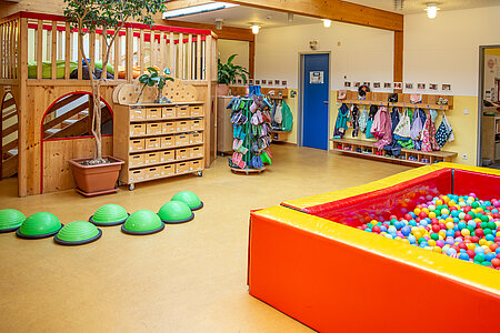 Das moderne und freundliche Gebäude bietet gute Voraussetzungen für die teiloffene Arbeit in dem Kindergarten. Aus ihren Stammgruppen gelangen die Kinder durch die helle großzügige Halle in verschiedene Spielbereiche z.B. Bällebad, Leseecke, Räuberhöhle mit großen Softbausteinen, Turnhalle und Funktionsräume.