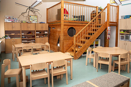 Außerdem gibt es eine Turnhalle mit viel Platz für Bewegung - sowohl im Freispiel als auch in Form von Angeboten - sowie einen großen Flur, der zusätzlich mit wechselnden Spielbereichen ausgestattet ist (bspw. eine „Verkleidungsecke“ zu Fasching).