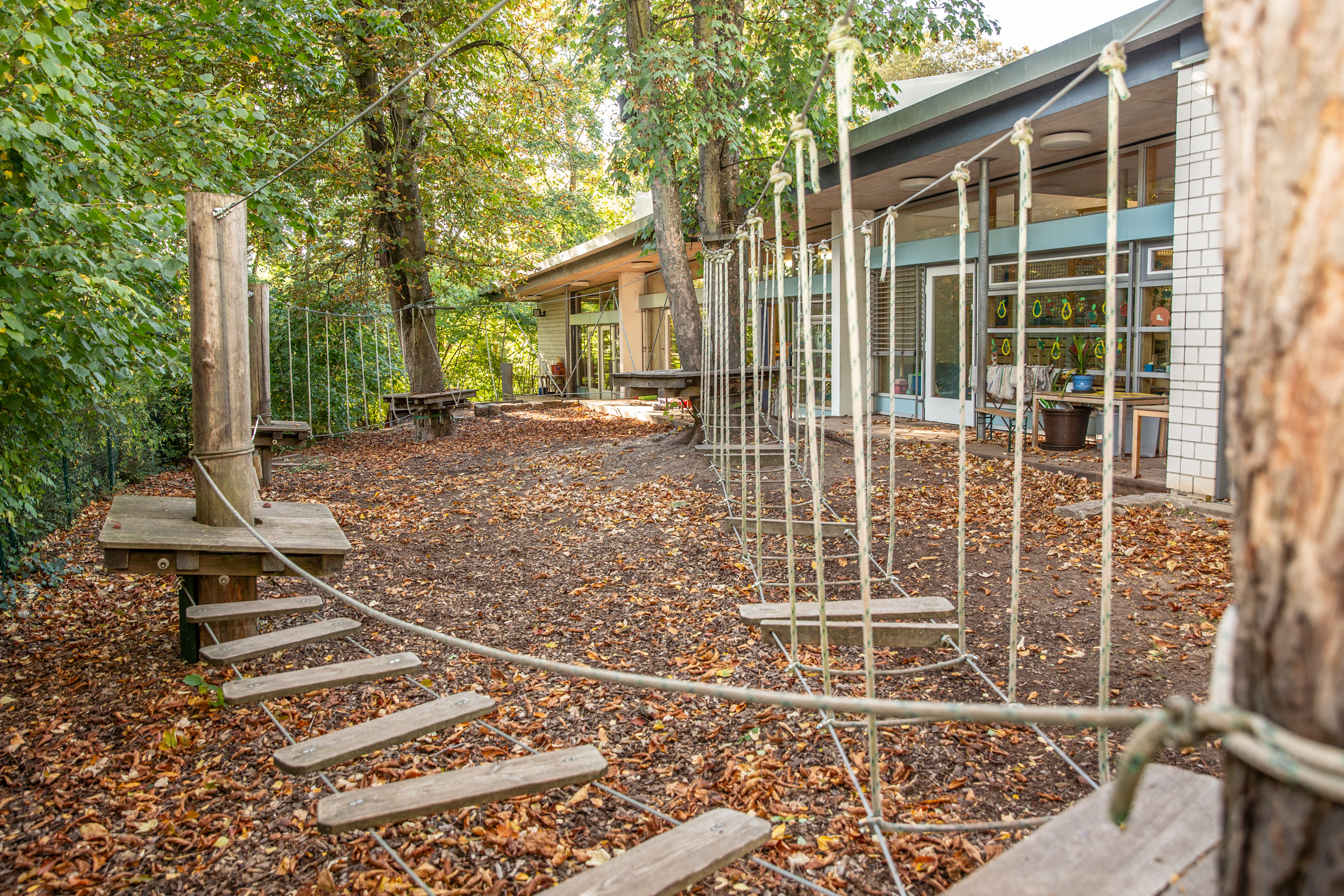 Im naturnahen Garten gibt es zwei Rutschbahnen, einen Sandkasten, verschiedene Schaukeln, einen Kletterbaum und viel Platz zum Toben. Die besonderen Highlights sind der Baumniedrigseilgarten und der Wasserspielplatz. Der Kirchplatz vor der Einrichtung wird zum Fahrradfahren genutzt. In der Freispielzeit können die Kinder den kleineren Teil des Gartens ohne Begleitung nutzen. In der Regel gehen wir täglich in unseren Garten. Durch verschiedene Sitzmöglichkeiten bieten wir Eltern die Gelegenheit sich mit anderen Eltern in ruhiger Atmosphäre auszutauschen, vorrangig in der Eingewöhnungszeit.