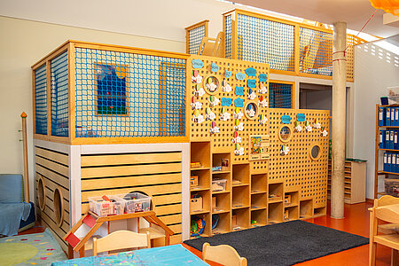 Im Kindergarten werden drei Gruppenräume mit unterschiedlichen Schwerpunktmaterialien durch die Turnhalle, ein Atelier, die Lernwerkstatt mit Kinderküche, die Bibliothek und das Bistro im Foyer ergänzt.