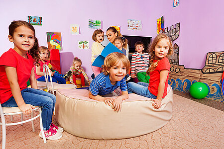 Alle freundlichen und hellen Räume, die mit altersgerechtem Mobiliar und Spielmaterial ausgestattet sind, bieten den Kindern einen Blick in den Garten. Die beiden Gruppenräume in der Krippe können durch den angrenzenden Schlafraum vergrößert werden. So können sich die Kinder frei bewegen, aber auch zurückziehen.