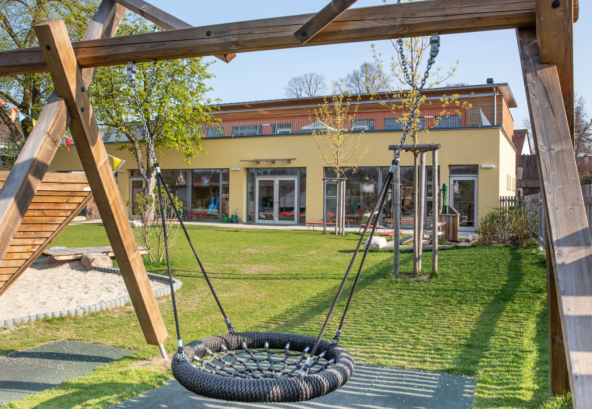 Die Räume des Hauses für Kinder sind Orte der Erfahrung und freien Entfaltung. Zur Krippe gehören ein Spiel-/Essraum mit Rutsche/Klettermöglichkeit, eine Kugelbahn, Puppenküche, ein zweiter Raum als Schlaf-/Spiel-/Bewegungsraum und ein Garderobenbereich. Als Funktionsräume stehen im Kindergarten Konstruktions-, Rollenspiel-, Bewegungs- und Kreativraum zur Verfügung sowie ein Mehrzweckraum für intensives Arbeiten mit Kleingruppen, ein Kinderbistro und ein großer Flurbereich.