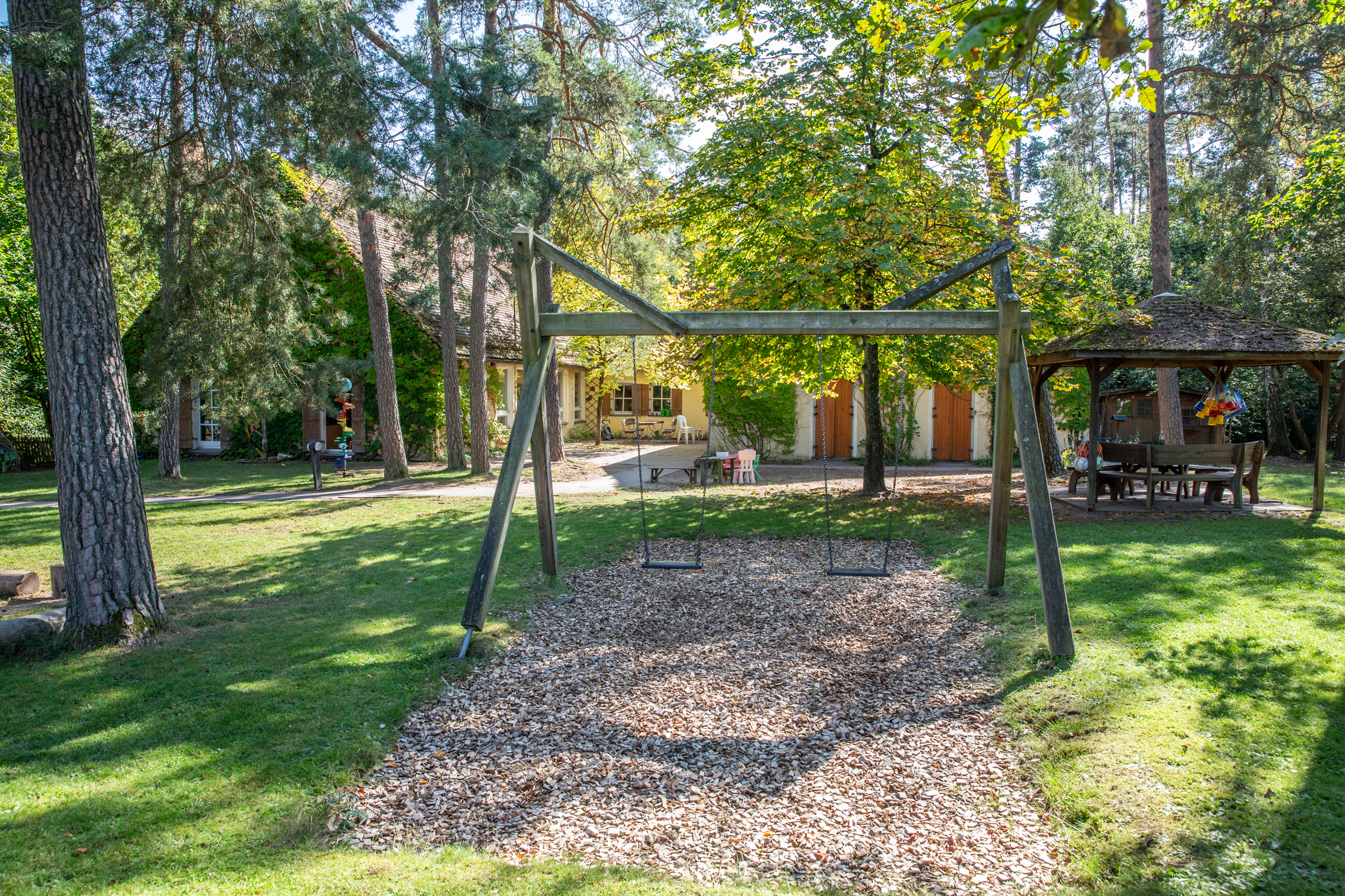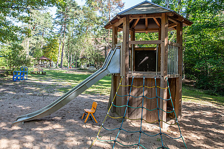 Ein großer Kletterturm mit Rutsche, ein großer Sandkasten, ein Weideniglu, eine Nestschaukel, eine Slakline und viele Matschtische stehen zur Verfügung.